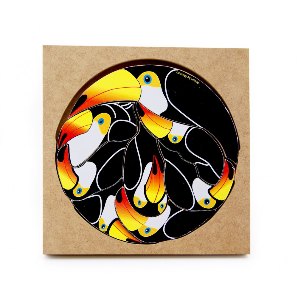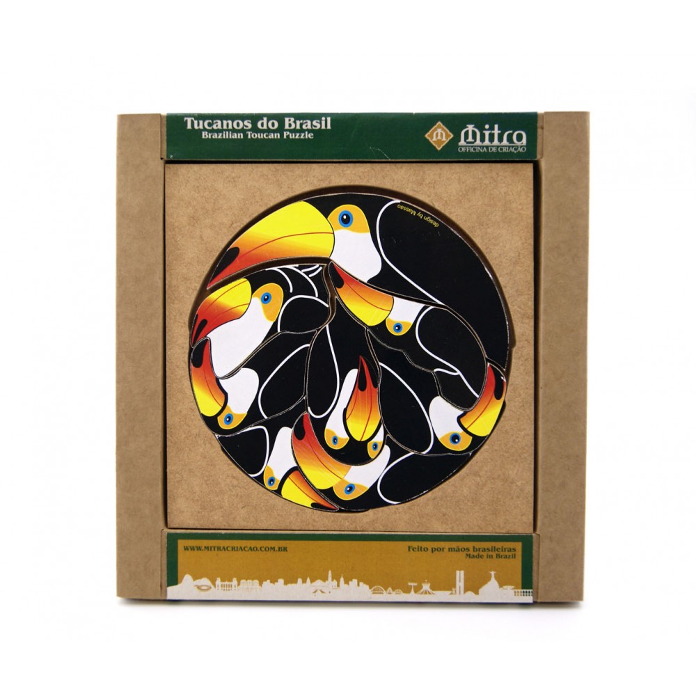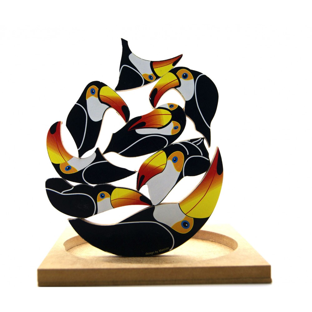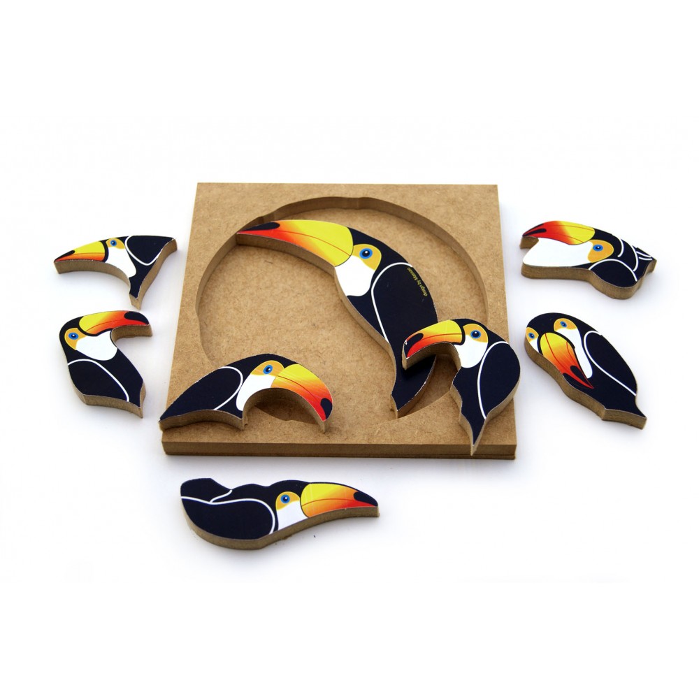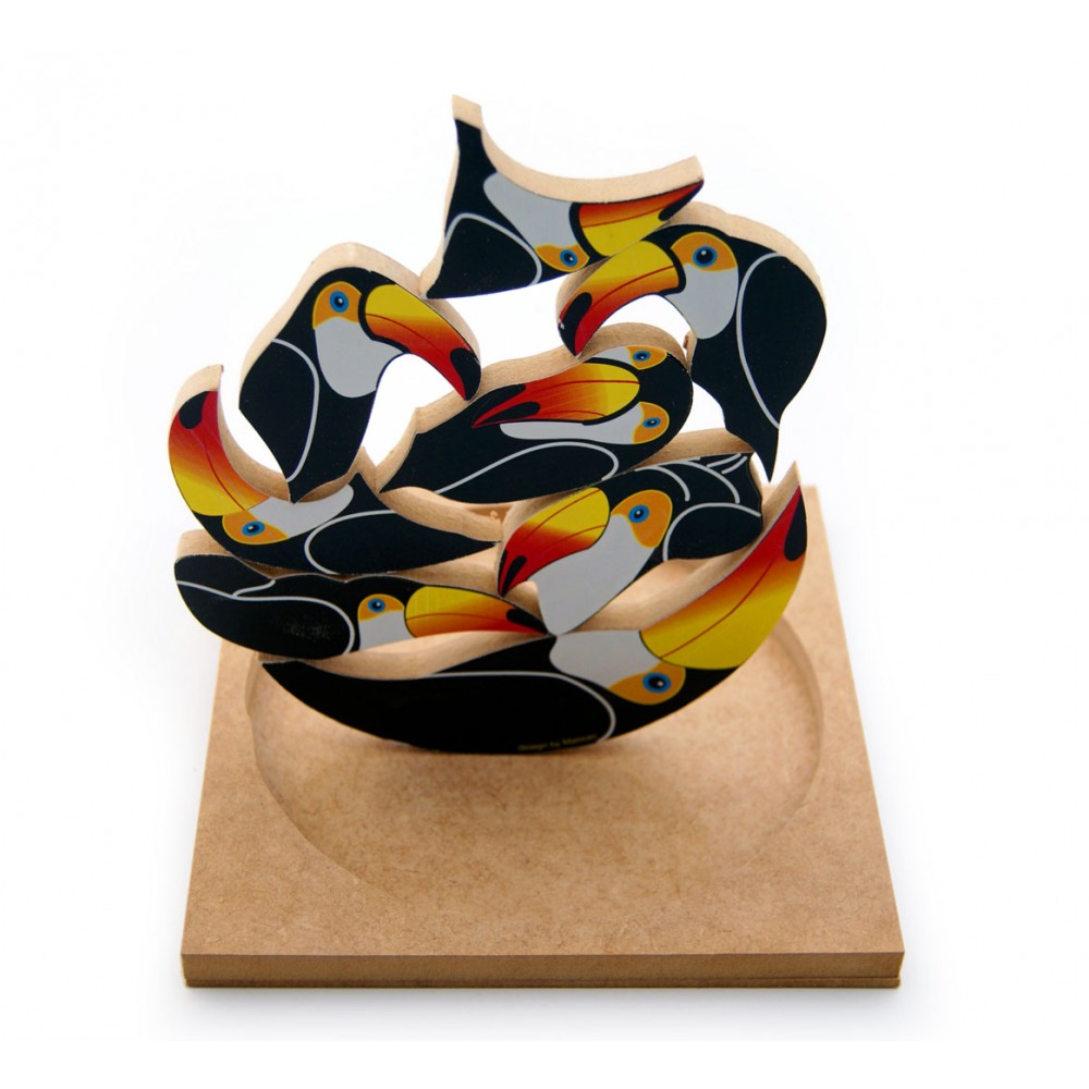 Com tema de Tucanos do Brasil, são dois desafios em um produto. Este quebra cabeça, pode ser um quebra cabeça normal encaixando todas as peças dentro da base, mas também pode ser um desafio de habilidade onde as peças devem ser equilibradas empilhando as peças uma em cima da outra.