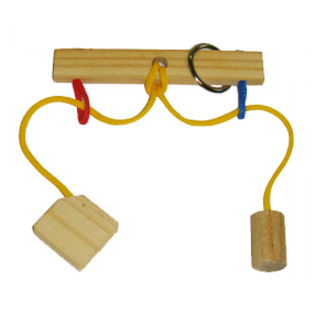 Neste desafio, o jogador deve soltar a argola que está presa no bastão de madeira.