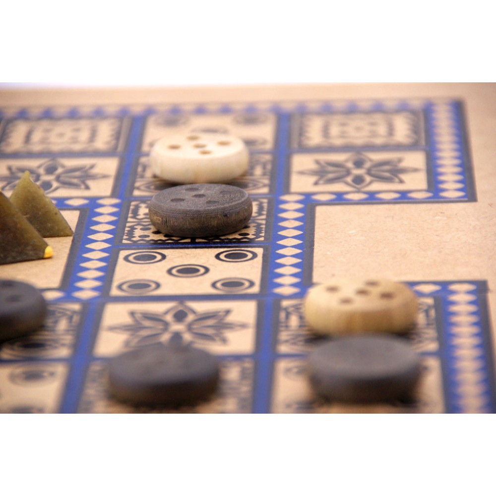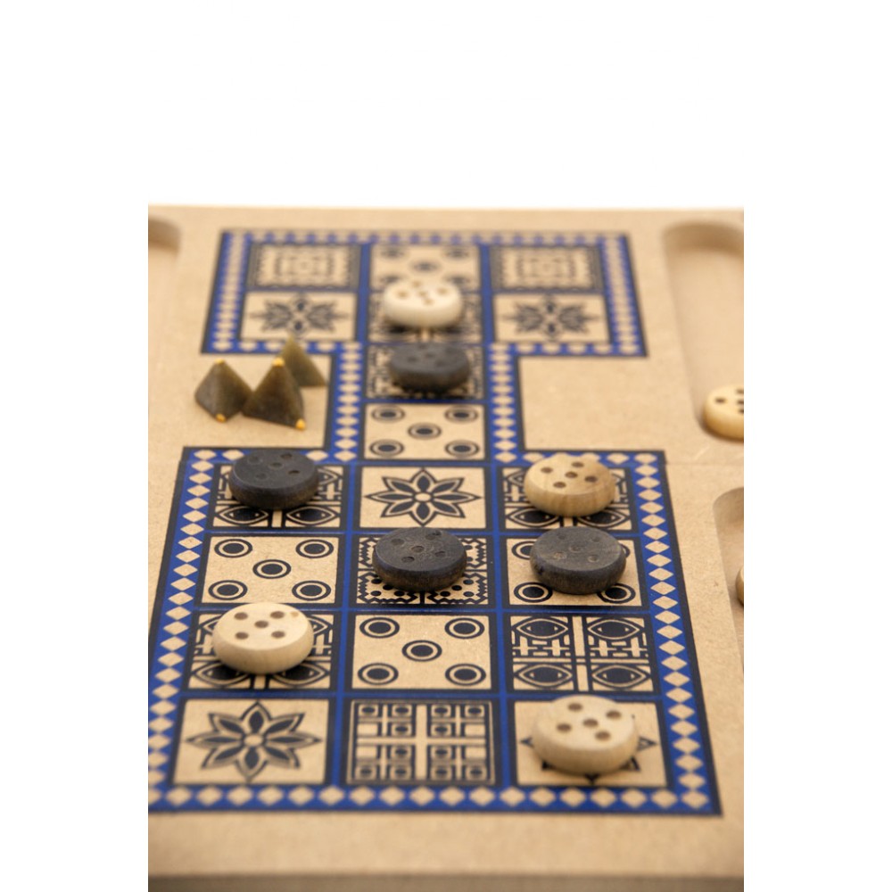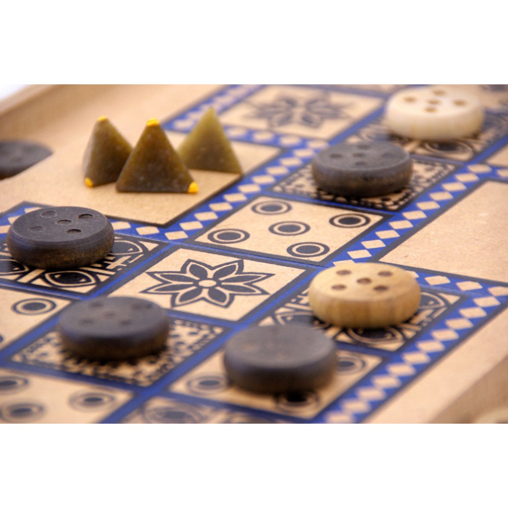Contém: 1 tabuleiro em MDF, 3 dados piramidais Conjunto de 7 peças em madeira clara; Conjunto de 7 peças em madeira escura Folheto com a história do jogo, regras e instruções para jogar.