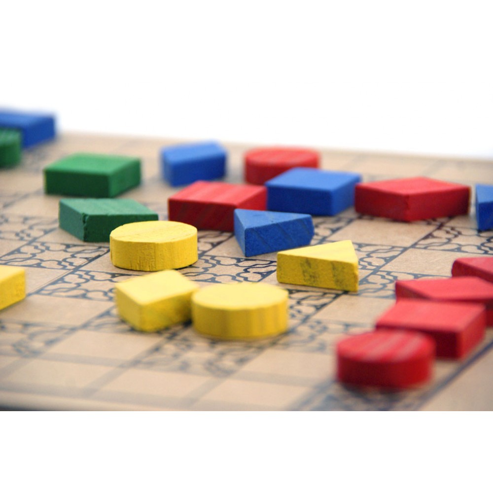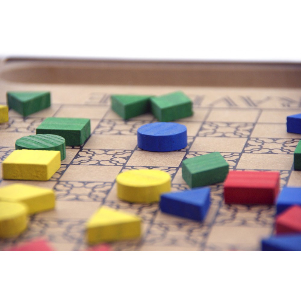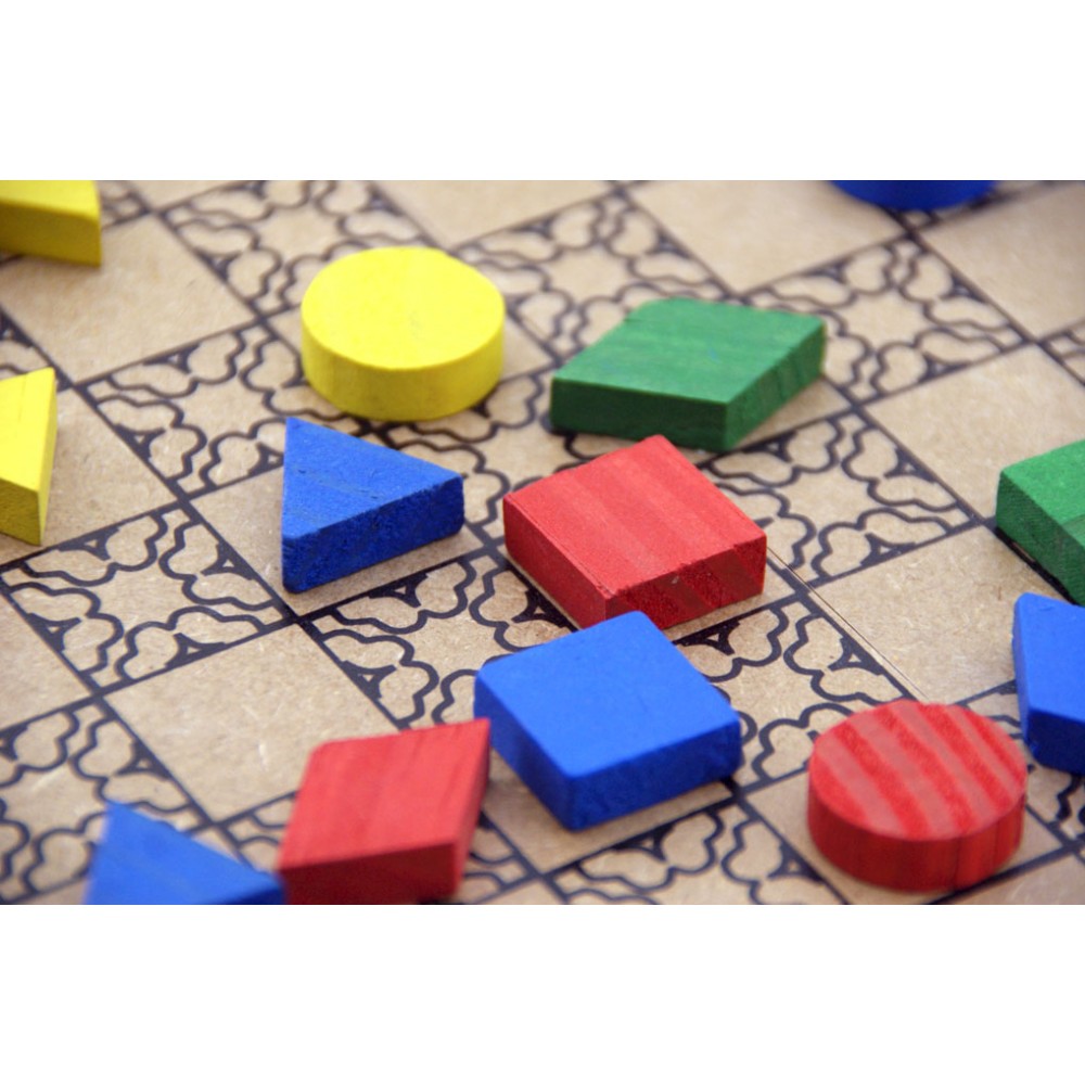 Contém: 1 tabuleiro em MDF 8 peças de cada cor (azul, vermelho, amarelo, verde) sendo: 2 triângulos, 2 losangos, 2 círculos e 2 quadrados. Folheto com a história do jogo, regras e instruções para jogar.