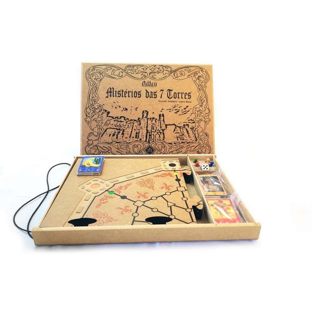 Contém: 1 tabuleiro em MDF 1 dado 4 pinos coloridos 3 conjuntos de 21 mistérios/dicas 3 conjuntos de 7 cartas das torres folheto com regras e instruções para jogar.