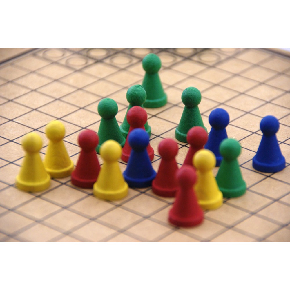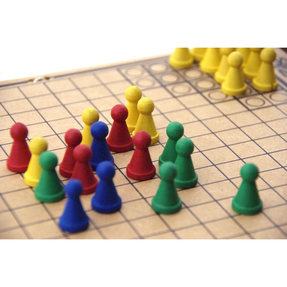Contém: 1 tabuleiro em MDF 76 peças em madeira sendo 19 amarelas, 19 vermelhas, 19 azuis e 19 verdes folheto com regras e instruções para jogar.