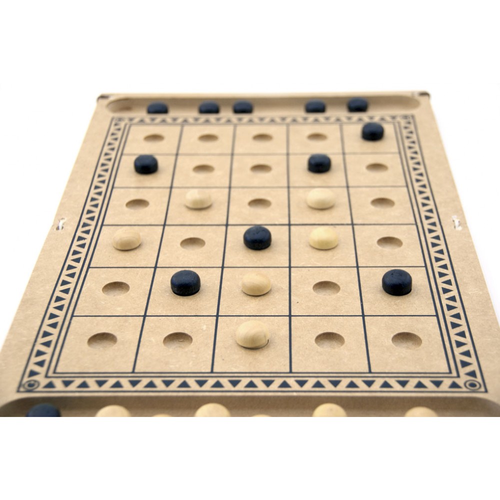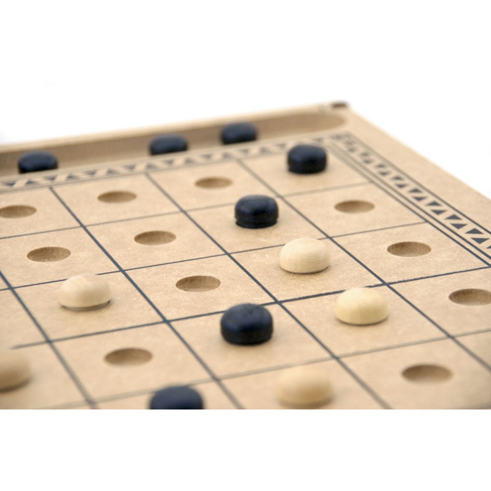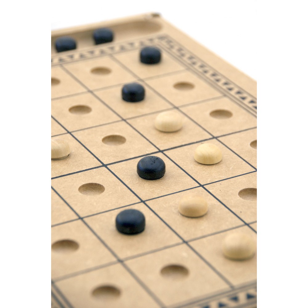 Contém: 1 tabuleiro em MDF 12 peças em madeira clara; 12 peças em madeira pretas folheto com regras e instruções para jogar.