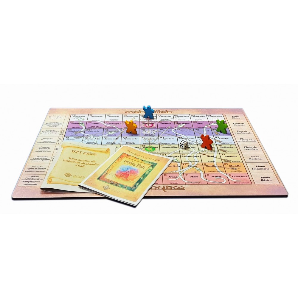Contém: 1 tabuleiro em madeira MDF com impressão colorida (62 X 46 X 0,9 cm); 1 dado ; 4 piões (para jogar a versão ocidental) + folheto com o manual contendo a história do jogo, regras e instruções para jogar + GPS do jogador Lilah para consulta dos significados das casas. Acompanha caixa em MDF com rótulo colorido, medindo 41 X 31 X 3,5 cm