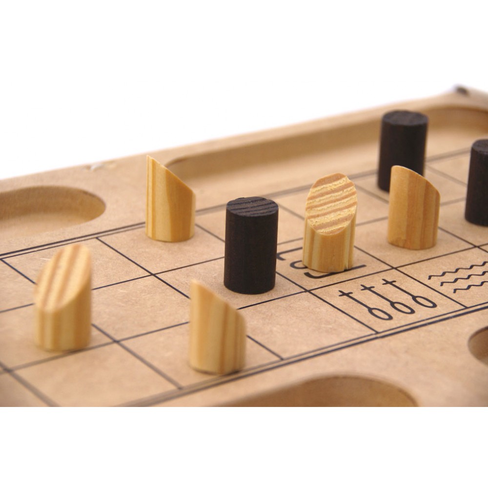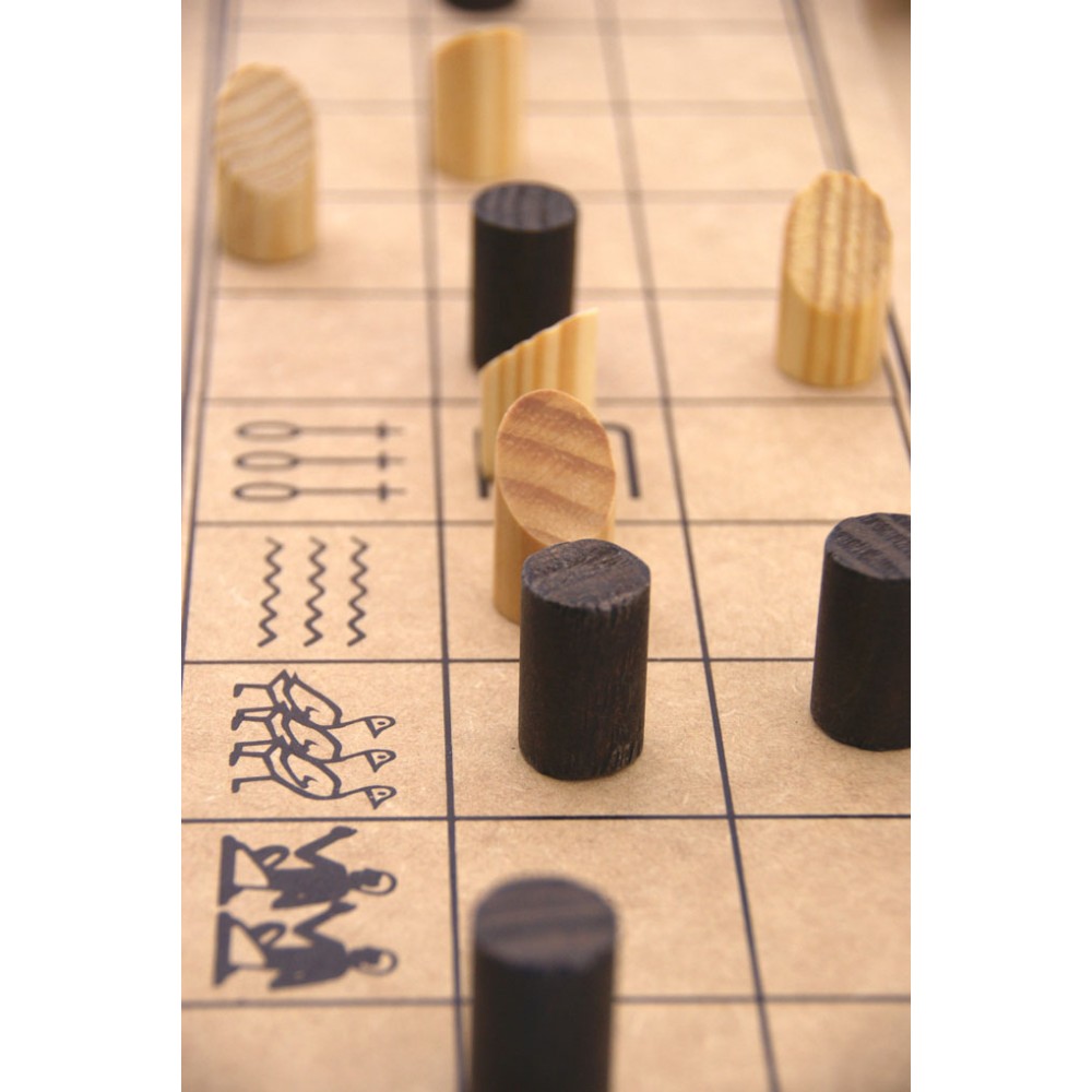 Contém: 1 tabuleiro em MDF 5 peças em madeira clara; 5 peças em madeira pretas; 4 peças em madeira, usadas como dados folheto com regras e instruções para jogar.