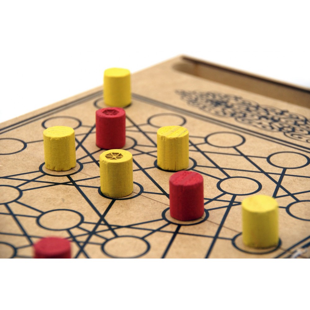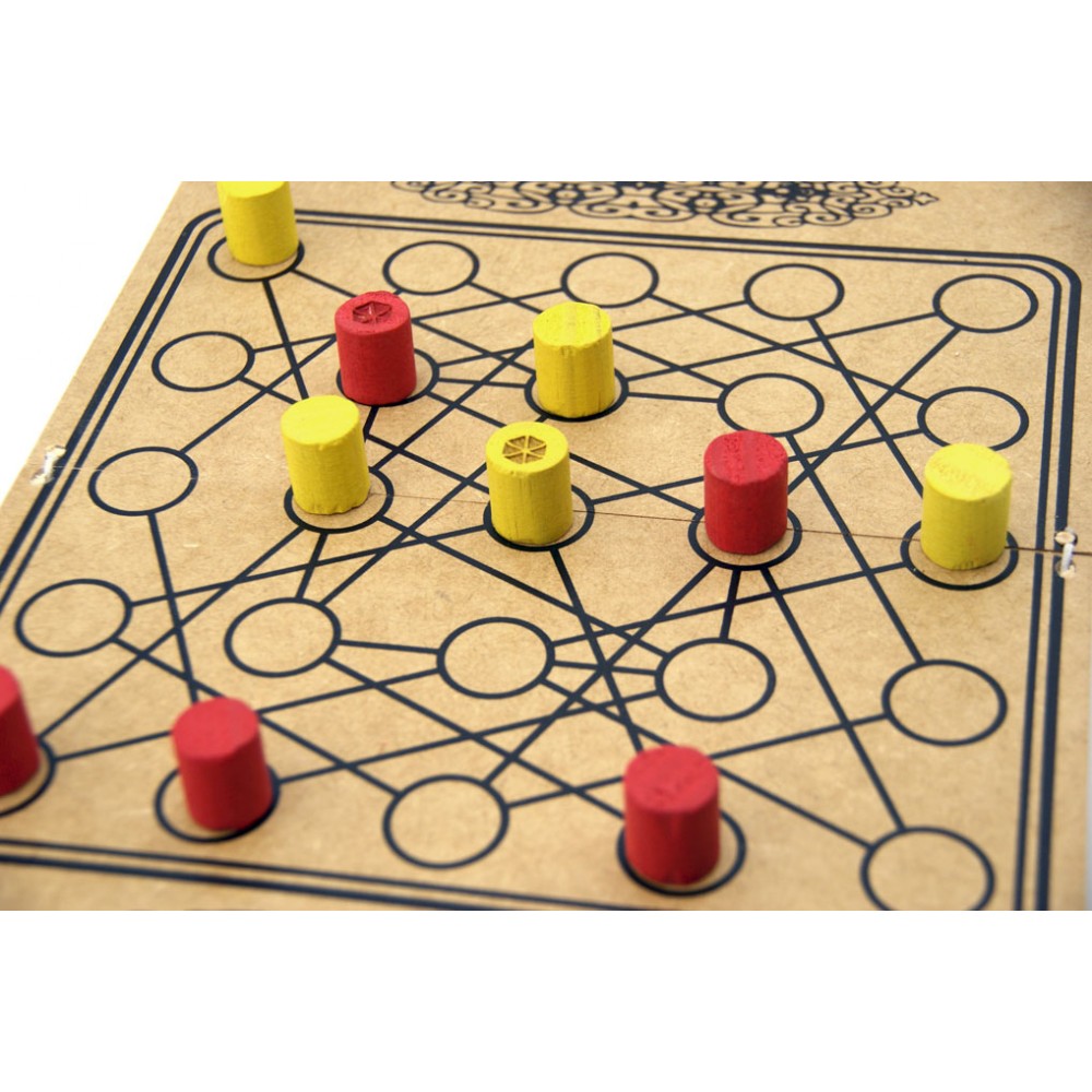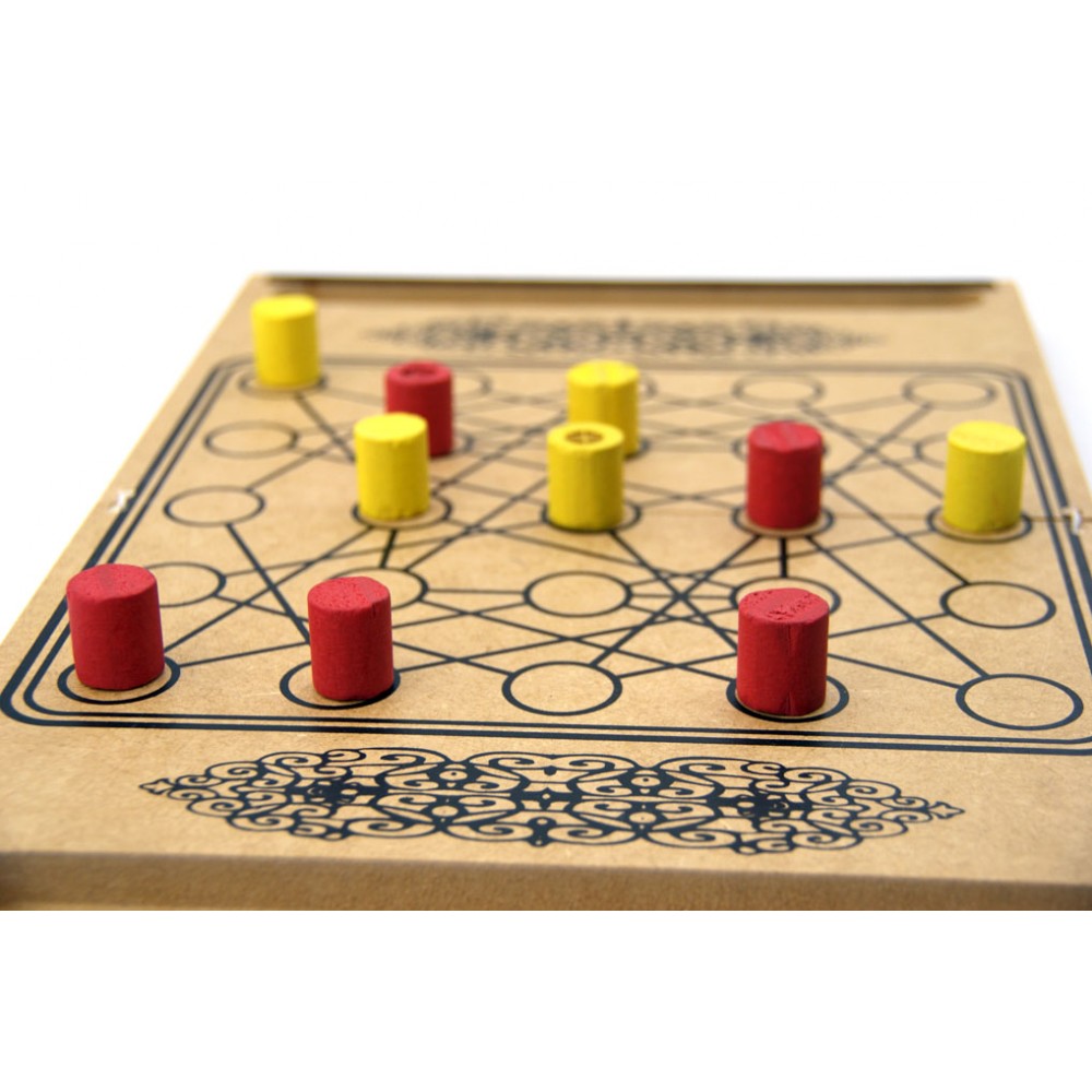 Contém: 1 tabuleiro em MDF 5 peças em madeira clara; 5 peças em madeira pretas folheto com regras e instruções para jogar.